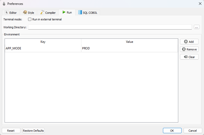 Il peut parfois être utile de jouer avec des variables d’environnement dans votre programme, alors si vous utilisez la fonction Run (▶) intégré à l’IDE, alors vous trouverez dans les préférences la possibilité d’injecter des variables d’environnement à l’exécution du programme, comme ceci :